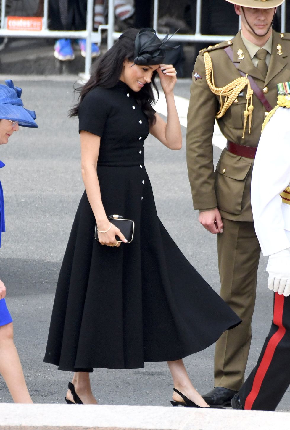 The Duchess of Sussex meets the public at Sydney Opera House on October 16, 2018, in Sydney, Australia in the Blessed dress by Sydney-based designer Karen Gee with Stuart Weitzman Legend pumps. (Photo via Mark Metcalfe/Getty)