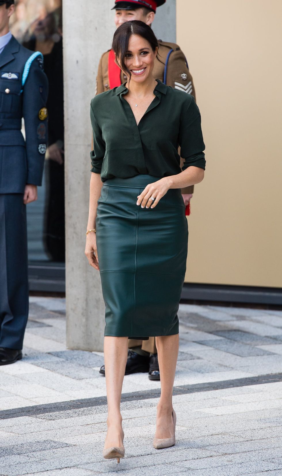 Markle visits University of Chichester in Sussex on October 3, 2018, in Bognor Regis, United Kingdom sporting a hunter silk shirt by & Other Stories worn with a Boss green leather skirt and nude heels. (Photo via Samir Hussein/Samir Hussein/WireImage)