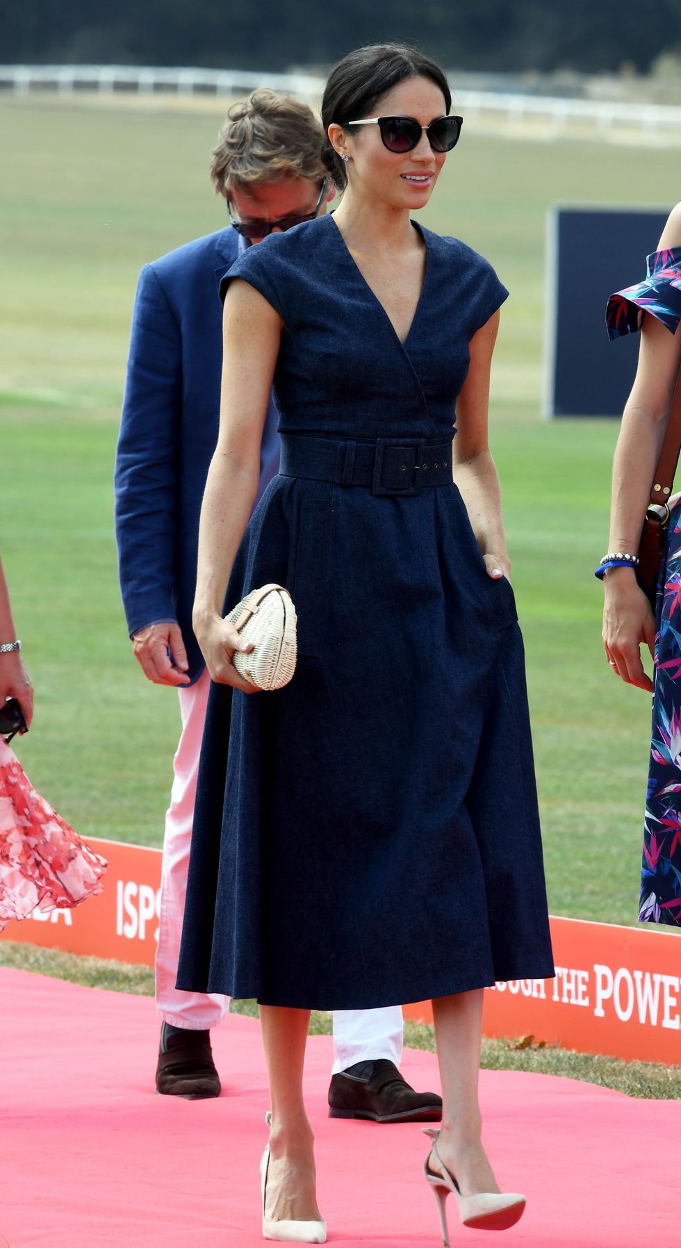 Markle visits the Royal County of Berkshire Polo Club on July 26, 2018, in Windsor, England wearing a v-neck denim midi dress by Carolina Herrera, a woven clutch by J.Crew, Tom Ford sunglasses, and Aquazzura heels. (Photo via Anwar Hussein/WireImage)