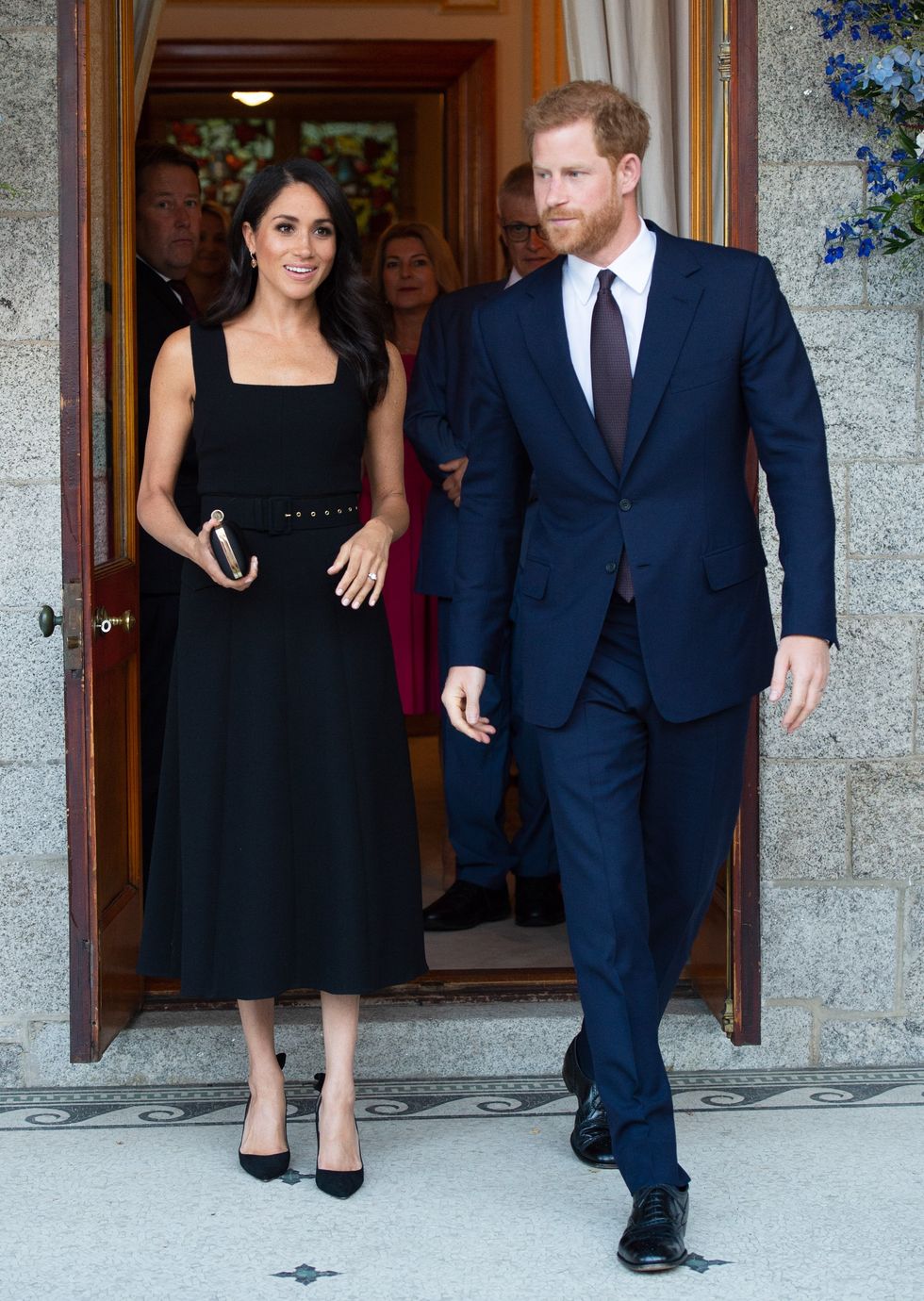The Duchess of Sussex attends a summer party at the British Ambassador's home in Dublin, Ireland on July 10, 2018, wearing a black Emilia Wickstead dress and belt. (Photo via Pool/Samir Hussein/WireImage)