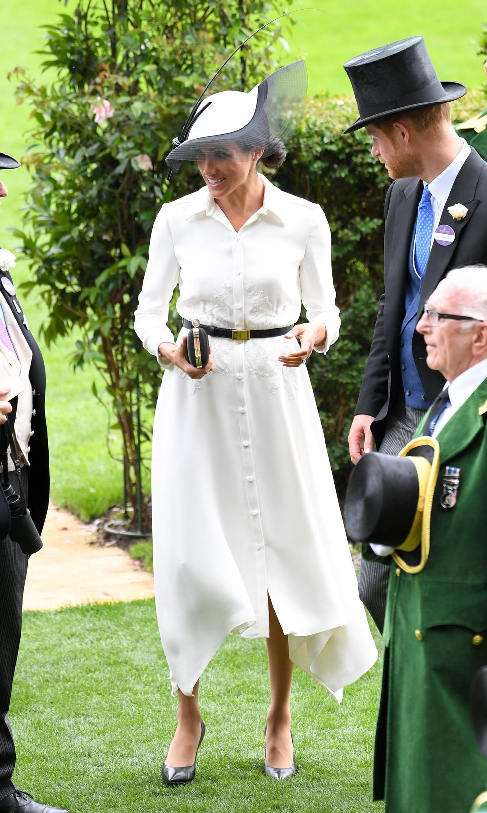 Markle goes to day one of the Royal Ascot at Ascot Racecourse on June 19, 2018, in Ascot, England wearing a Givenchy shirt dress, black clutch, and belt with a coordinating Philip Treacy hat. (Photo via Karwai Tang/WireImage)