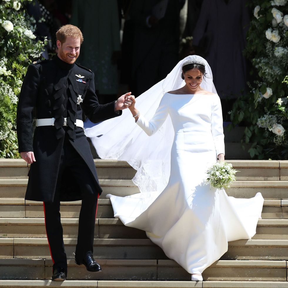 Markle leaves St George's Chapel after her wedding at Windsor Castle on May 19, 2018, in Windsor, England wearing her headline-making gown designed by Clare Waight Keller for Givenchy, hand embroidered veil, and the Queen Mary diamond bandeau tiara that was created in 1932. (Photo via Jane Barlow - WPA Pool/Getty)