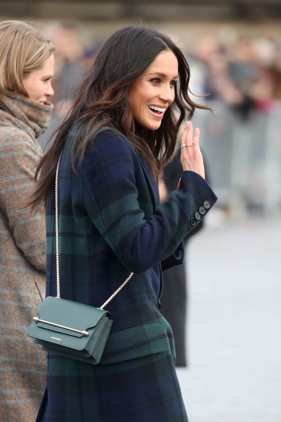 The fashionista’s statement coat wasn’t the only sartorial nod to Scotland, though; she also carried a Scottish-made crossbody purse from the Edinburgh-based company, Strathberry. Apparently the Suits actress is fond of the handbag label because, according to reports from People, she also carried a Strathberry bag at her very first official royal outing in Nottingham.
