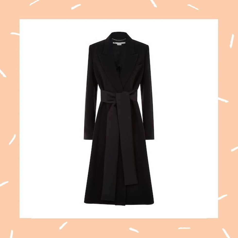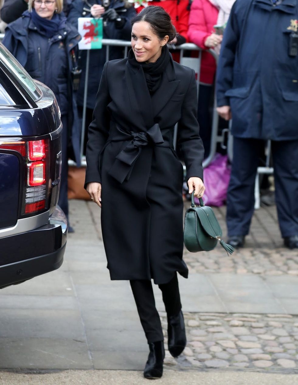The Suits star continued her sartorial rebellion in a black Stella McCartney Tie-Detail Coat ($1,973), (somber hues are a no-no for members of the Royal family), Hiut The Dina Jeans in a skinny fit (about $245 USD), Tabitha Simons Kiki Boots ($825), and a calf leather Demellier London The Mini Venice Bag ($395) in forest green.