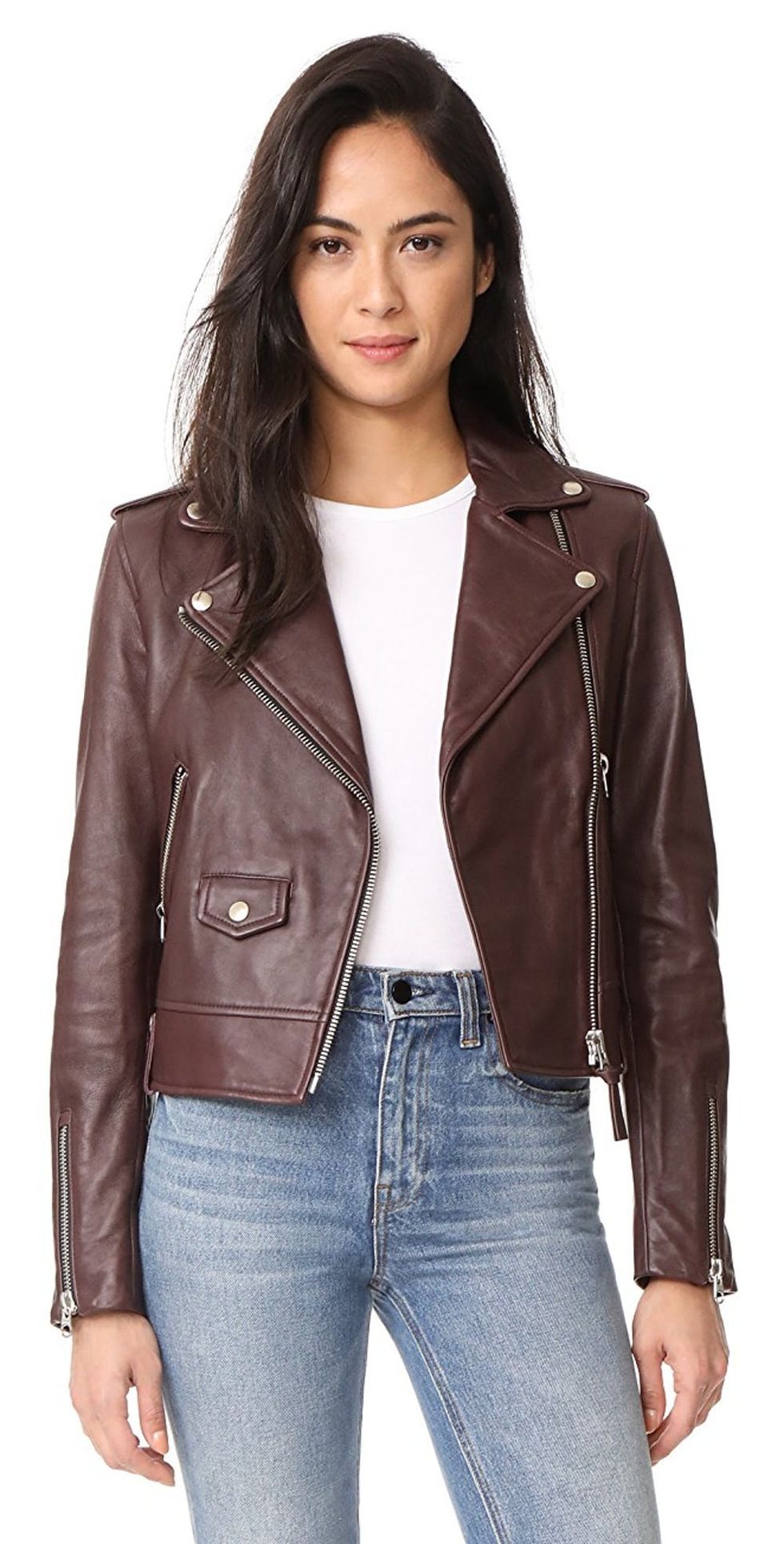 While her Wilfred Beaune Dress ($185) by Aritzia is sold out in the Truffle color, we’ve got all the details on her Bordeaux-colored leather jacket.
