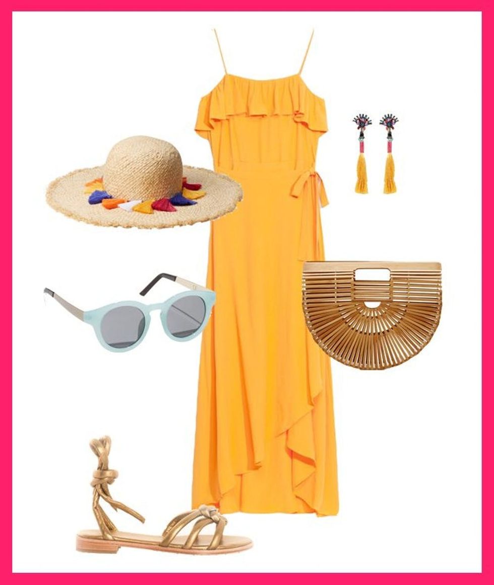 2. Wedding Weekend: Whether you’re a bridesmaid, maid of honor, or attendee, a flirty day dress that turns heads will always do you right. Between the golden yellow hue and frilly ruffles, this Grecian-inspired maxi delivers no shortage of Drama (with a capital D). Throw in a tassel sunhat (which can be worn like a backpack, BTW), an of-the-moment bamboo clutch, and strappy bronze sandals for the wedding lewk of the season.