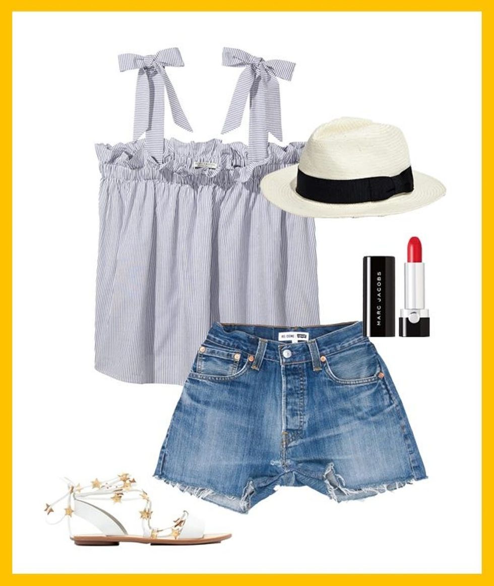 Scotch & Soda Tie-Up Top ($98), Re/Done High Rise Short ($204), Marc Jacobs Beauty Le Marc Lip Crème in Oh Miley 200 ($30), Madewell x Biltmore Panama Hat ($58), Loeffler Randall Starla Ankle Wrap Sandal ($195)