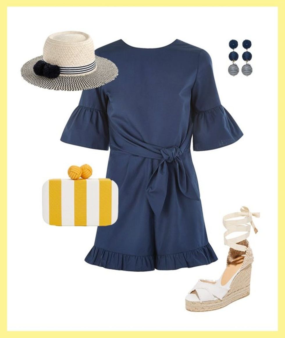 4. Hamptons/Montauk Getaway: A stint in the Hamptons or Montauk calls for a #navyornothing uniform that transitions from day to night with minimal effort. We call dibs on this navy blue playsuit that can be elevated with a few simple accessories — namely, a sunny yellow striped convertible clutch, a straw hat, and sophisticated bauble drop earrings. Whether you’re soaking up rays on a yacht or sipping fruity umbrella drinks at the beach house, a pair of sensible lace-up wedges will ensure a blister-free weekend.