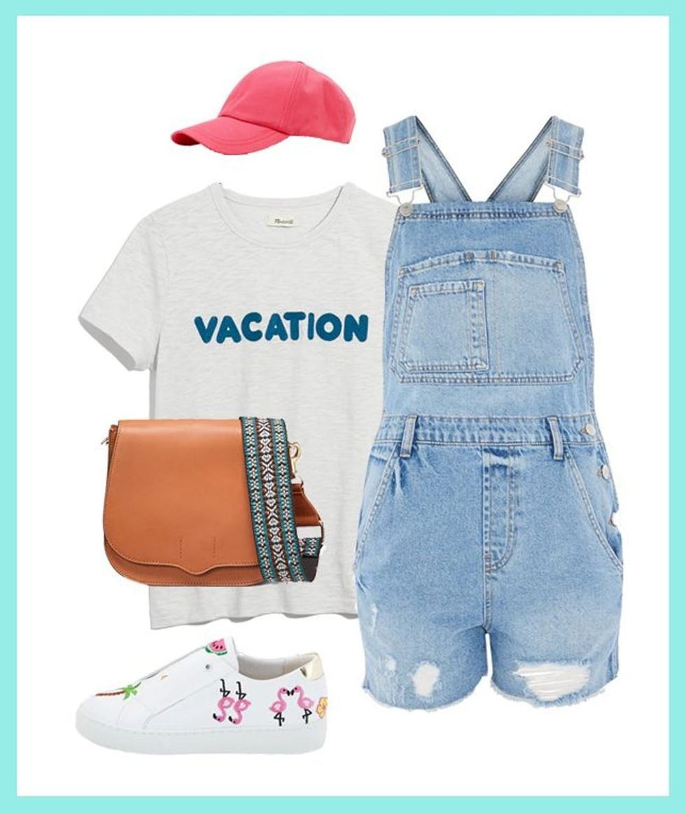 Topshop Moto Boyfriend Short Dungarees ($75), Madewell Embroidered Vacation Tee ($35), Zara Basic Cap ($16), Rebecca Minkoff Sunday Saddle Bag ($295), Here/Now Kamea Beach-Embroidered Sneaker ($260)