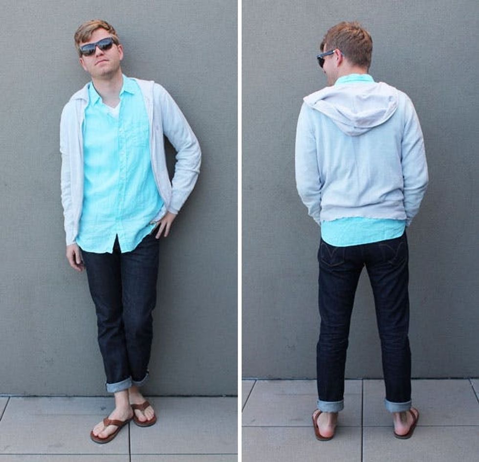 Rules: A light hoodie is a great layer and can be made a little more masculine by pairing it with a button down underneath. When rocking flip flops, we recommend a double or triple cuff.