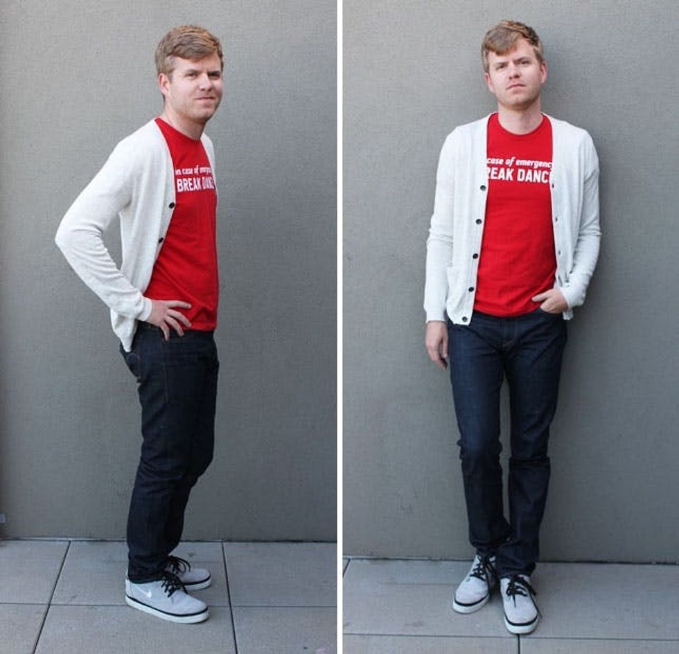 Rules: Don’t button a cardigan if you’re wearing it with a tee. Make sure you only have one bright color so you don’t look too much like a camp counselor. And a pair of modern high top sneakers are a must! No cuff on this one.