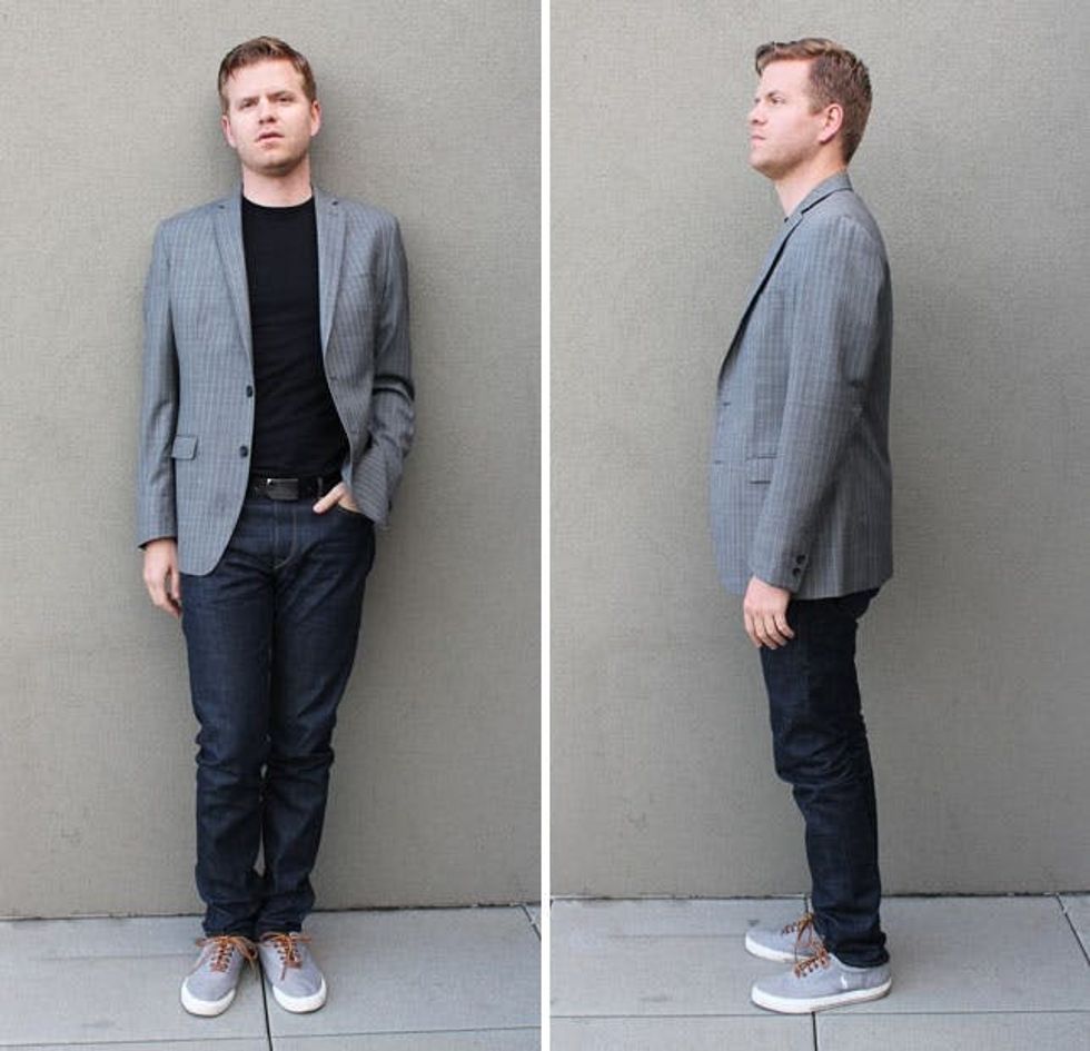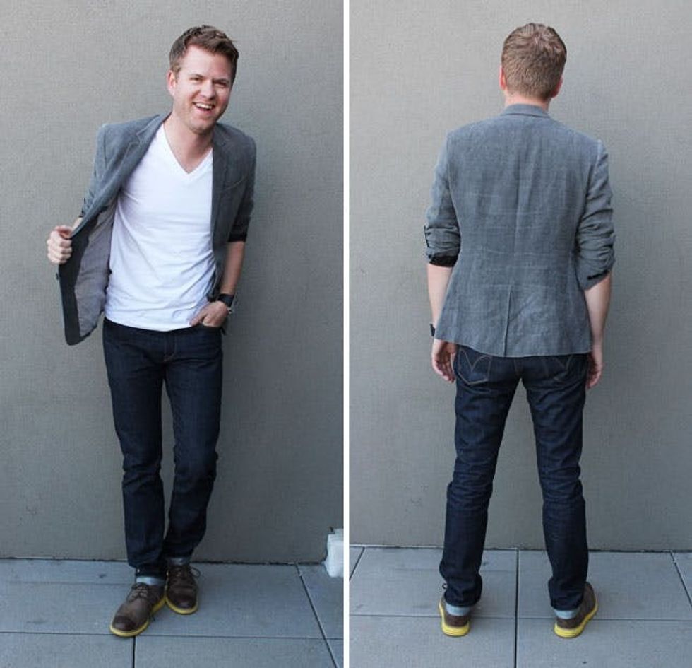 Rules: If your suit jacket has flair of its own, pair with a super basic tee. To make this look even more casual, we threw on a pair of boat shoes, no cuff.