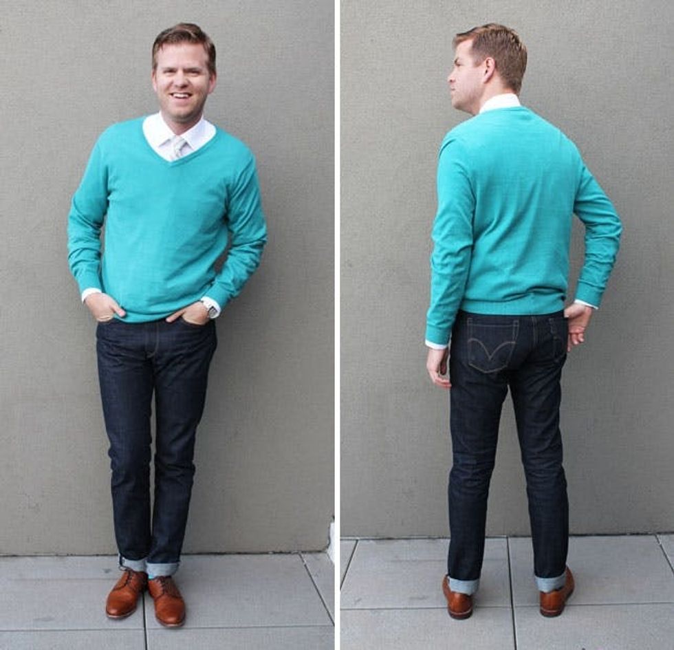 Rules: Go for a neutral tie and white shirt to offset the brightness of your sweater. For shoes, we paired another pair of oxford-style shoes with a single cuff.