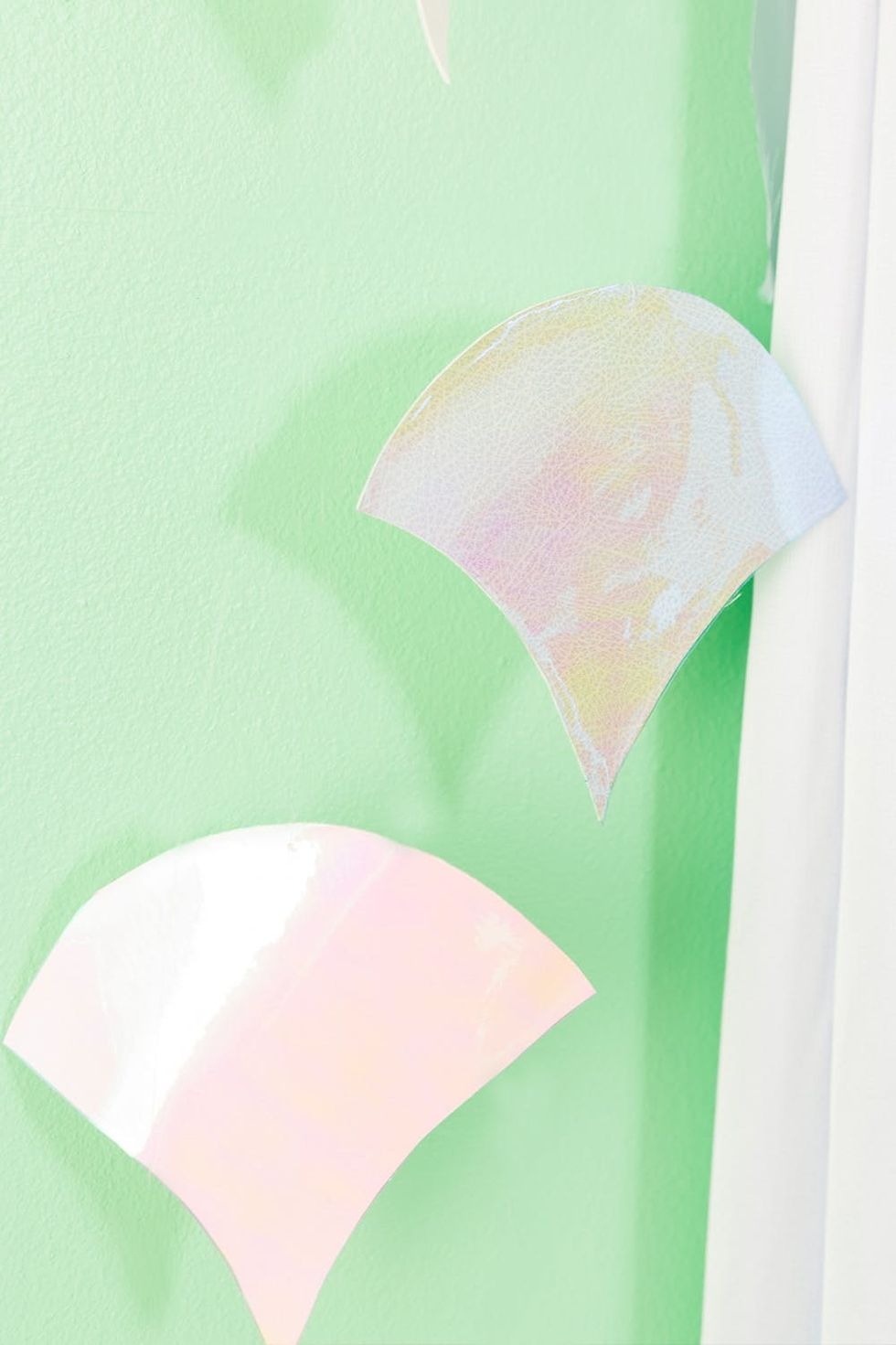 Make some colorful scales to hang as well. Cut a scale shape out of the faux leather and cover a few with the holographic vinyl. We love using the faux leather because it gives a nice texture, while being sturdy enough to hang down from the curtain rod.