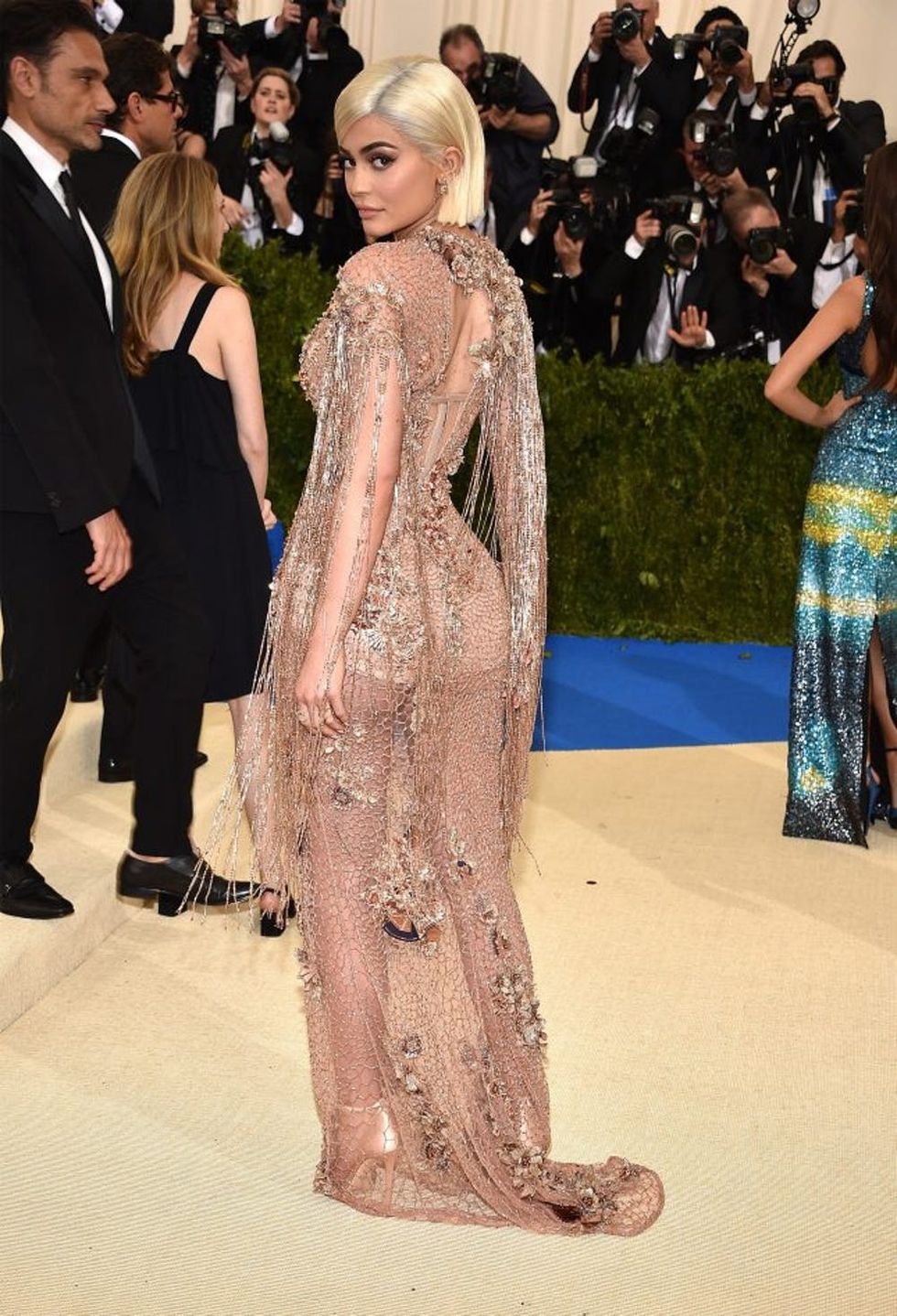 Kylie came to slay tonight in a flesh-tone, see-through Versace beaded gown that left little to the imagination. (Photo via Kevin Mazur/WireImage)