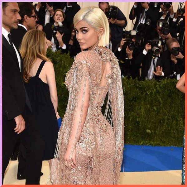 Kylie came to slay tonight in a flesh-tone, see-through Versace beaded gown that left little to the imagination. (Photo via Kevin Mazur/WireImage)