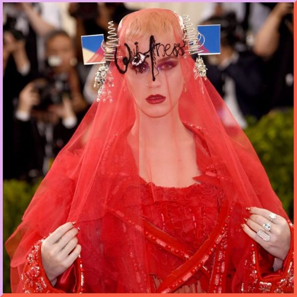 1. Katy Perry: Never missing an opportunity to show her flair for the dramatic, gala co-chair Katy Perry showed up in layers of red tulle, complete with a veil and space-age “Witness” headpiece. (Photo via Dimitrios Kambouris/Getty)