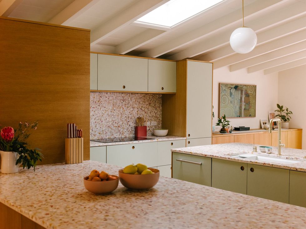 The clients are huge fans of terrazzo and Barrett incorporated the material onto the kitchen countertops and backsplash, which preserves the mid-century look.