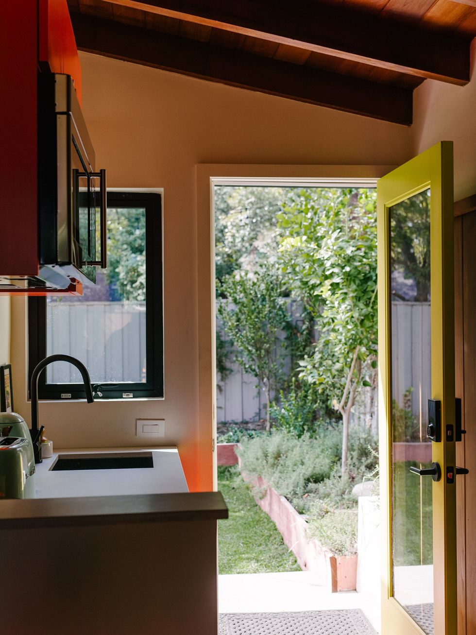 Barrett converted the garage into a guest house Here's another yellow door leading to a little kitchenette, a separate entrance to the cozy space. Love this home? Check out the whole home here!