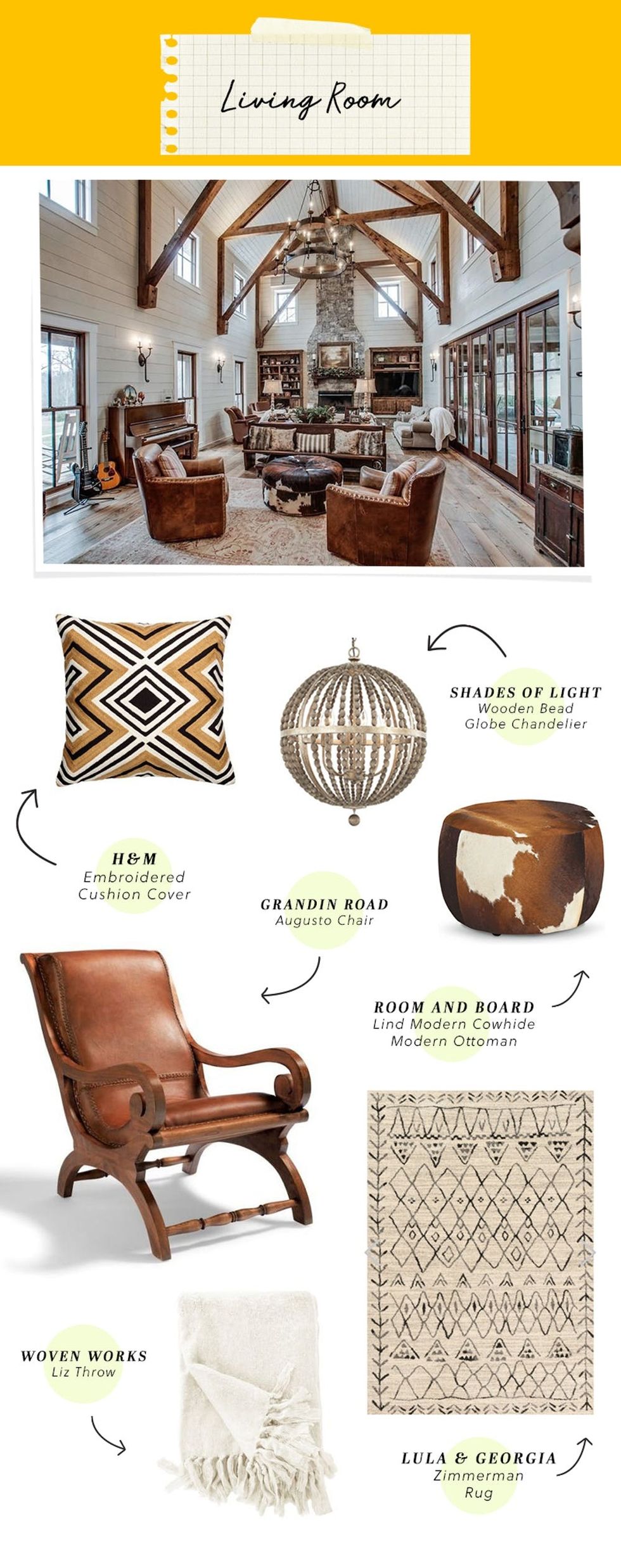 Clockwise from top left: H&M Embroidered Cushion Cover ($30), Shades of Light Wooden Bead Globe Chandelier ($512), Room and Board Lind Modern Cowhide Round Ottoman ($499+), Lulu & Georgia Zimmerman Rug ($149+), Woven Works Liz Throw ($39), Grandin Road Augusto Chair ($699)