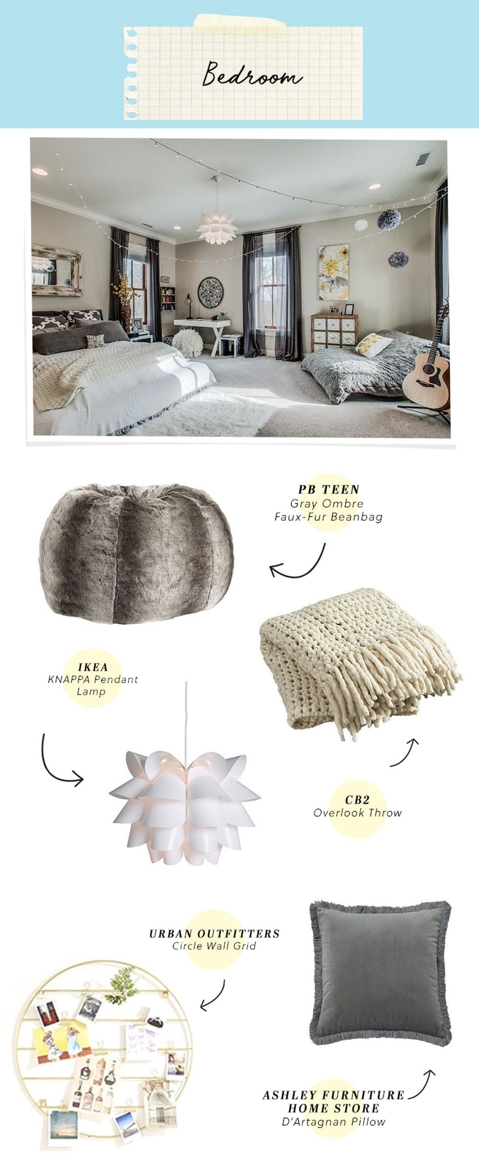 Clockwise from top left: PBteen Gray Ombre Faux-Fur Beanbag ($109+), CB2 Overlook Throw ($129), Ashley Furniture Home Store D’Artagnan Pillow ($25), Urban Outfitters Circle Wall Grid ($34), IKEA KNAPPA Pendant Lamp ($25)