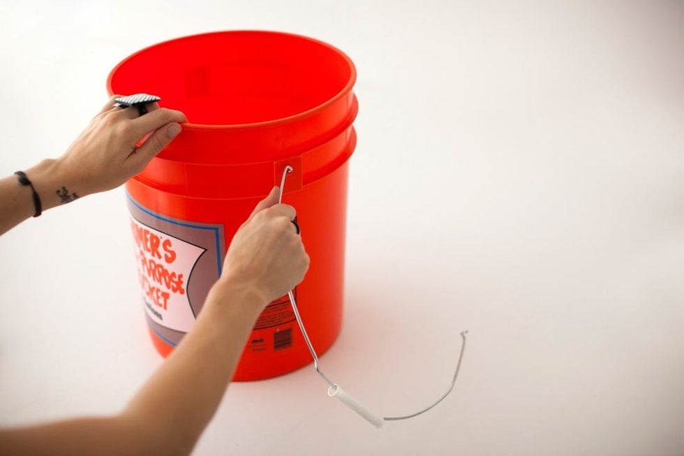 First thing to do is to remove the handle from your orange bucket. It should pop right out but if it sticks, grab some pliers and yank it out.