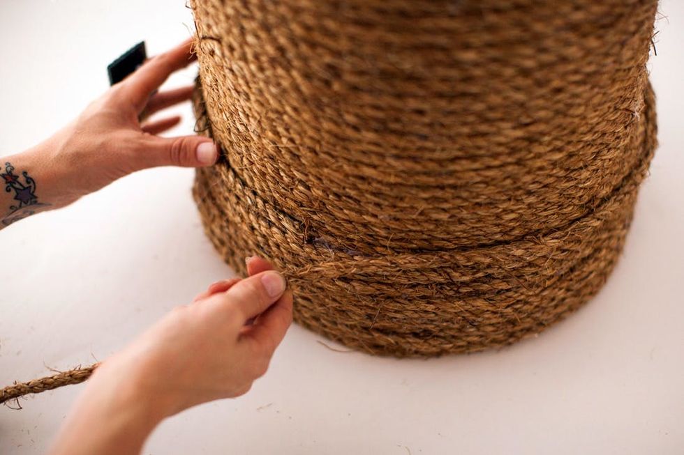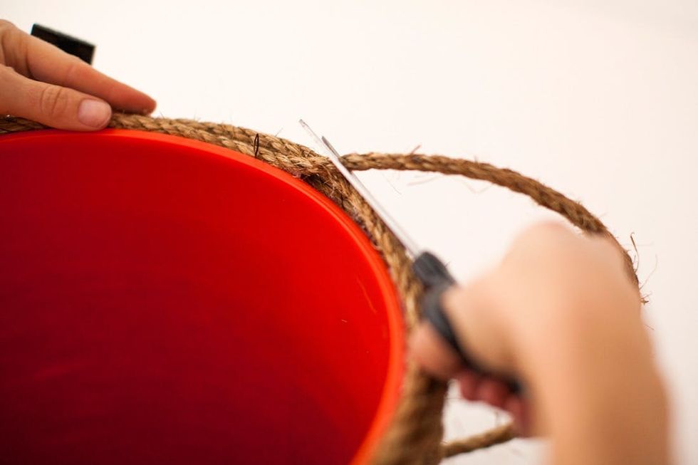 Next, we’ll cover the bucket by wrapping it with rope. Start at the bottom and squeeze hot glue onto the rope, then press the rope onto the bucket. Keep wrapping, making sure each new row of rope is secured closely next to the previous row. You don’t want any orange peeking out!
