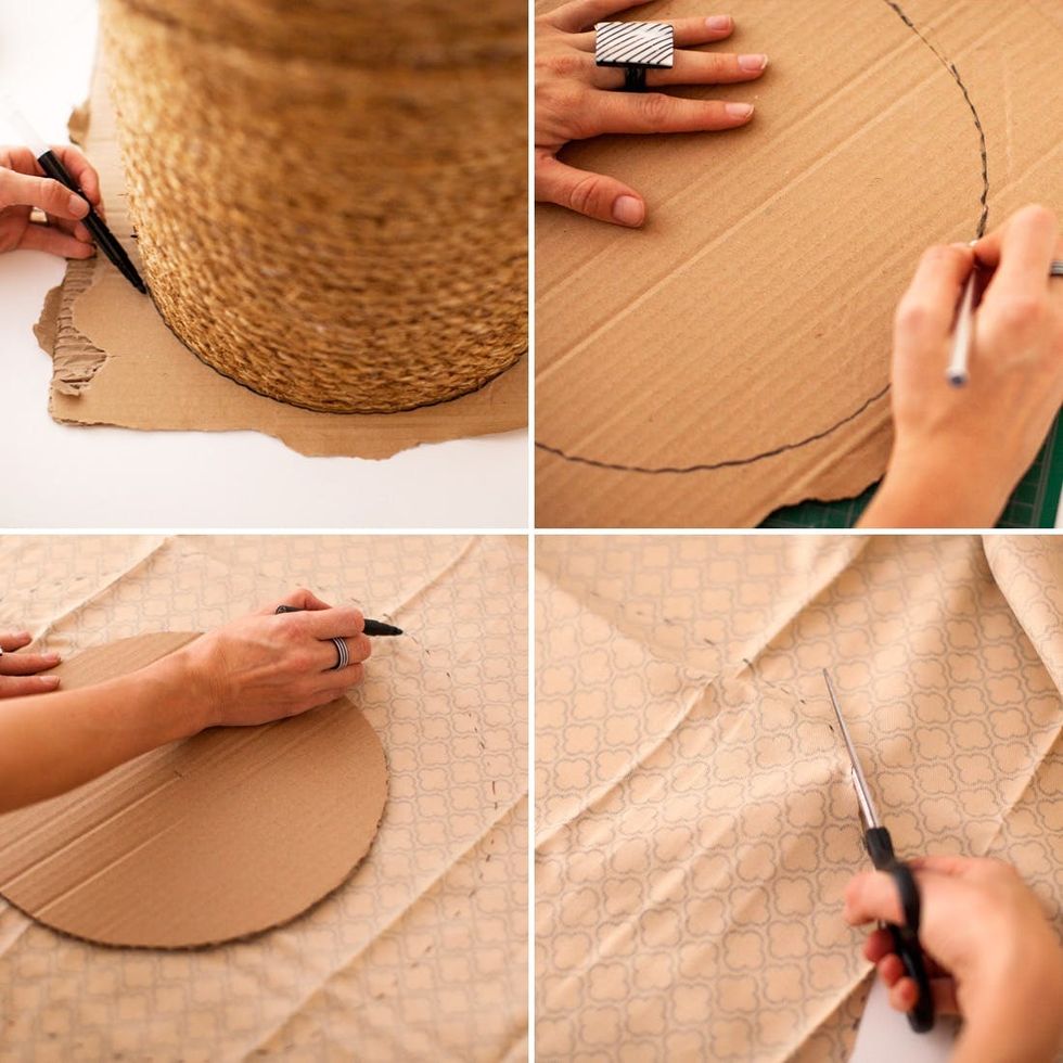 Now, it’s time to create that cushion. Start by creating a cardboard base. Trace the bottom of the bucket onto cardboard. Cut out. Place on your fabric and draw a circle that is three inches larger than the cardboard. Cut the fabric.