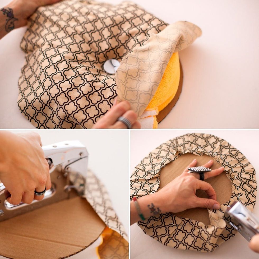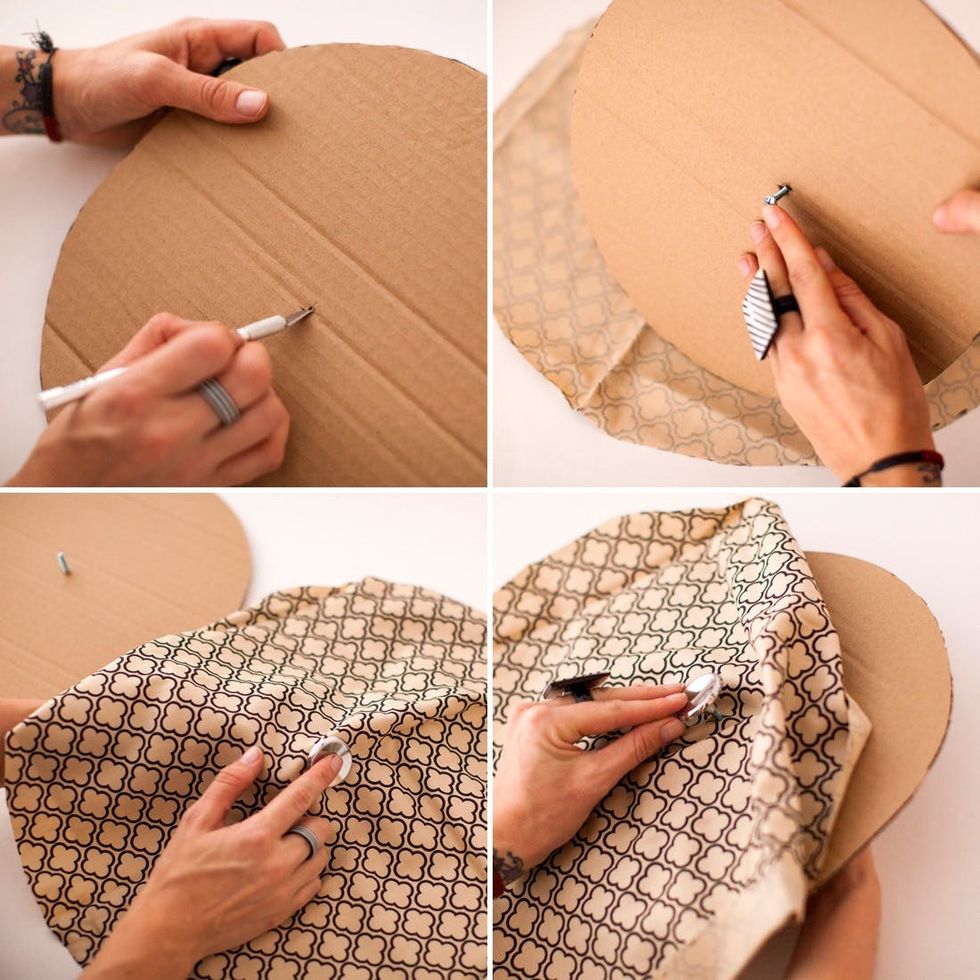Use an xacto knife to pierce a hole in the middle of the cardboard. Grab a drawer knob, unscrew it, and place the screw end of through the cardboard. Place the fabric over that end, and screw on the knob. If your fabric is extremely thick, you might need to cut a little hole in the center of the fabric circle.