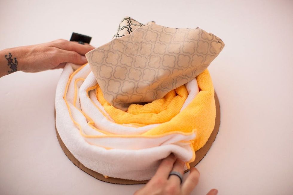 For stuffing, we used microfiber towels! You could also use excess fabric or stuffing, but these have a nice cushion to them. Fold one up and wrap around the center of the fabric. Glue onto the cardboard.