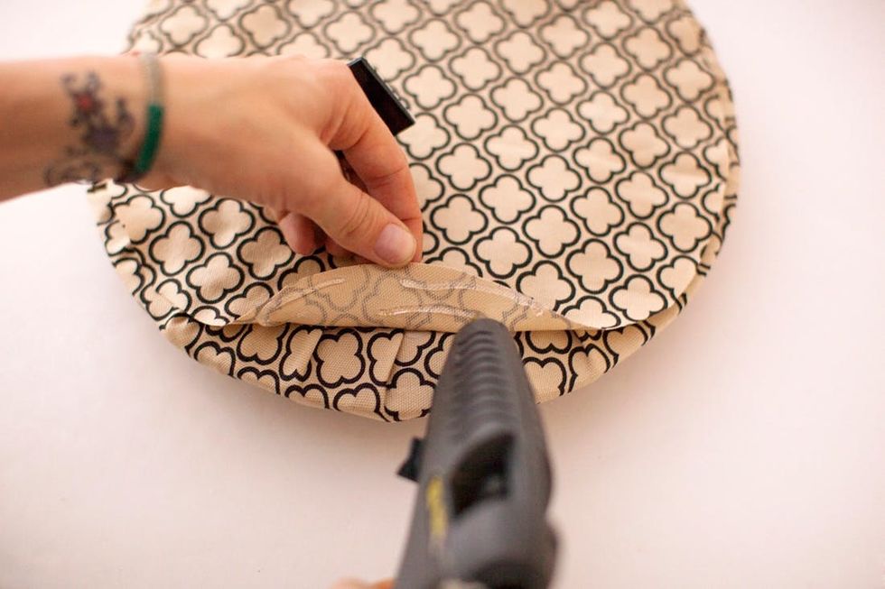 Cut a fabric circle that’s a little smaller than your cushion, and glue onto the back to cover up the stapled fabric and cardboard.