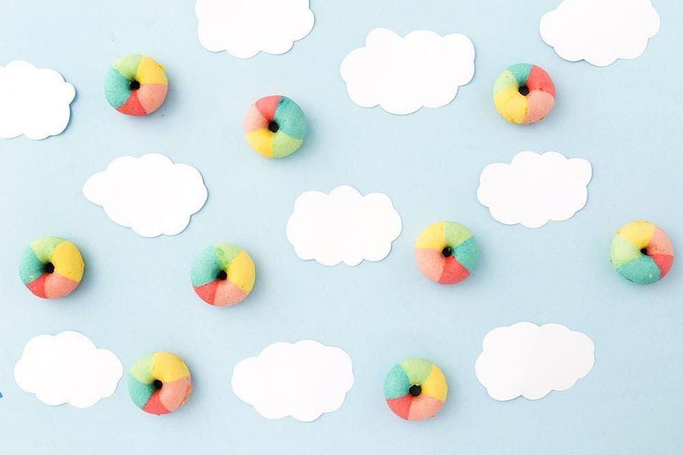 Scoop the frosting into a microwave-safe bowl and microwave it for 30 seconds to melt the frosting. If the frosting isn't totally melted, keep microwaving it 10 seconds at a time until it's fully melted. If you are feeling extra colorful, you can add Lucky Charms marshmallows over the glaze. Ta-da! Mini rainbow donuts!