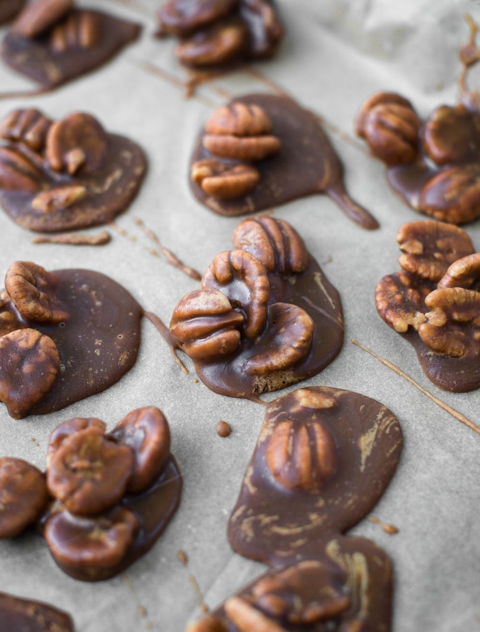 5. Using a large spoon (or a 2-tablespoon scoop), scoop heaping tablespoons of the mixture onto the lined baking sheets. The goal is to create a small pool of caramel with 4 to 5 pecans per cluster. Let them sit at room temperature for about 45 minutes, or until completely frosted in color.