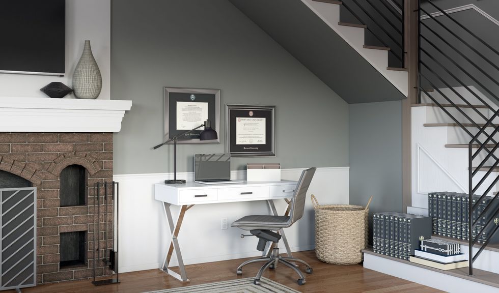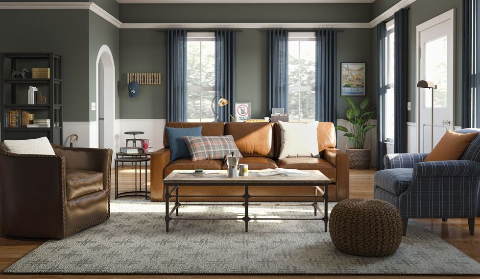 Luke: Take it from Modsy's VP of style on what makes this setup speak to the Gilmore Girls leading man: "Luke's style is warm and masculine, and not too thought out, which is why we went for a masculine green when painting his living room. There are some hand-me-down pieces from his dad’s hardware store which he easily mixes in with different weathered woods, metals, leathers, and especially plaid," she says. "He doesn’t care too much about design but appreciates a well made, durable piece. There are rustic and industrial elements that are balanced out with comfortable, large pieces for the ultimate man cave."