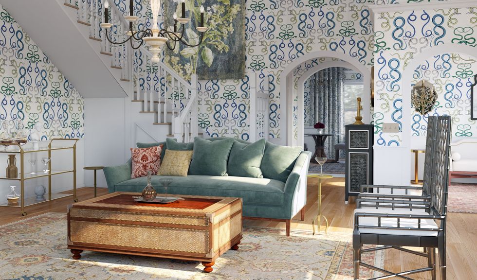 Emily: Last, but not least, is Emily. Her room is depicted here with a nod to classic design with a modern twist for the character's unique personality and taste. "Emily would love rethinking the layout of the space, and would ultimately end up with a more formal layout of the space than Lorelai previously had," says Wood. "She immediately creates a space that is fit for conversation and small gatherings." When can we come over?