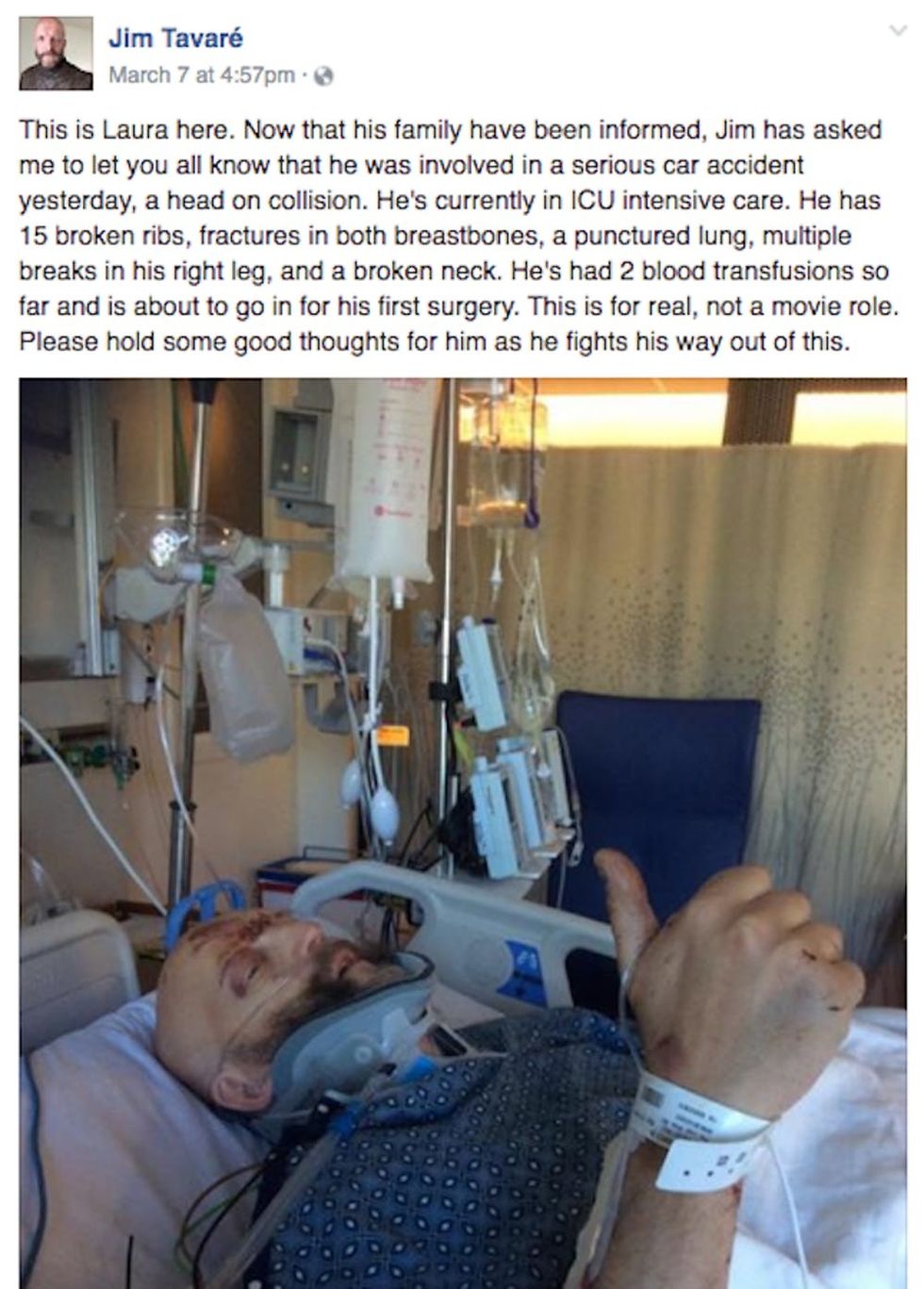 3. Harry Potter actor Jim Tavaré has suffered multiple injuries and is in ICU after a bad car accident. Tavaré, who Harry Potter fans will know as Tom, the owner of the Leaky Cauldron, was in a head-on collision and is in serious condition. “He has 15 broken ribs, fractures in both breastbones, a punctured lung, multiple breaks in his right leg, and a broken neck,” his wife wrote on his Facebook page, along with a photo of Tavaré looking extremely banged up but giving the thumbs up nonetheless. “This is for real, not a movie role. Please hold some good thoughts for him as he fights his way out of this.” All the best for a speedy recovery! (Photo via Jim Tavaré/Facebook)