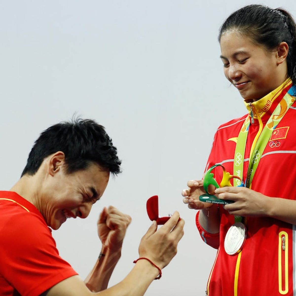1. Chinese diver He Zi won’t only be taking home the silver in the women’s three-meter springboard — she’ll be taking a gorgeous engagement ring too! After her medal ceremony last night, the two-time Olympian was surprised when her boyfriend (and fellow Team China diver) Qin Kai got on the podium. He THEN got down on one knee to propose. Stunned by the gesture, she managed a shocked nod as her BF arm-pumped in excitement. Adorable!