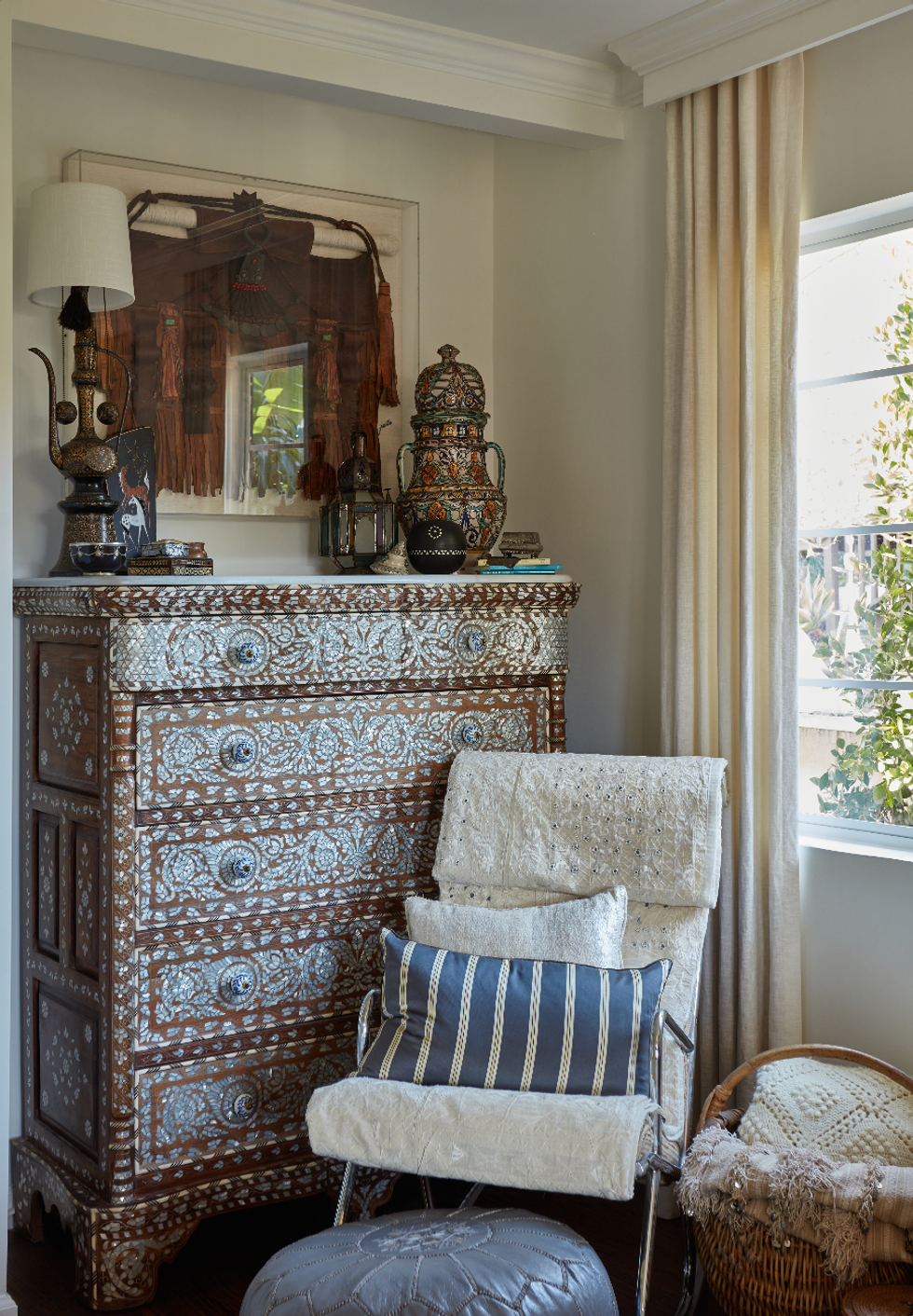 I purchased the antique Syrian wedding chest dresser in the guest room many years ago and it has moved all around the world with me from the UK to my small flat in NYC. I never had a proper place to really showcase it before so when I built the house I decided to demo out the linen closet in the guest room to create the perfect nook for her to really come to life. When the sun shines through the windows in the morning her mother of pearl shimmers so beautifully and the craftsmanship is truly incredible, you see a new detail every time you look at it!
