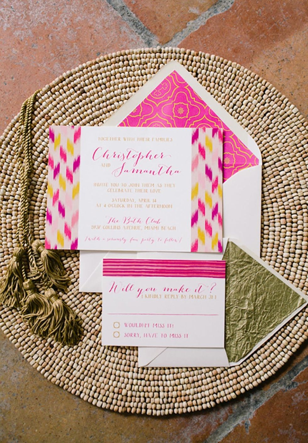 5. Bold Pattern Invites: Try a colorful print and trellis pattern to set the scene before the event kicks off. (via Erika Delgado Photography / 100 Layer Cake)