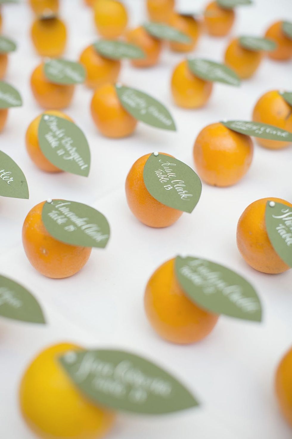 7. Citrus Place Card Holders: Using oranges or lemons as placecard holders looks so stunning grouped on a table. (via Sarah Kate Photography / Style Me Pretty)