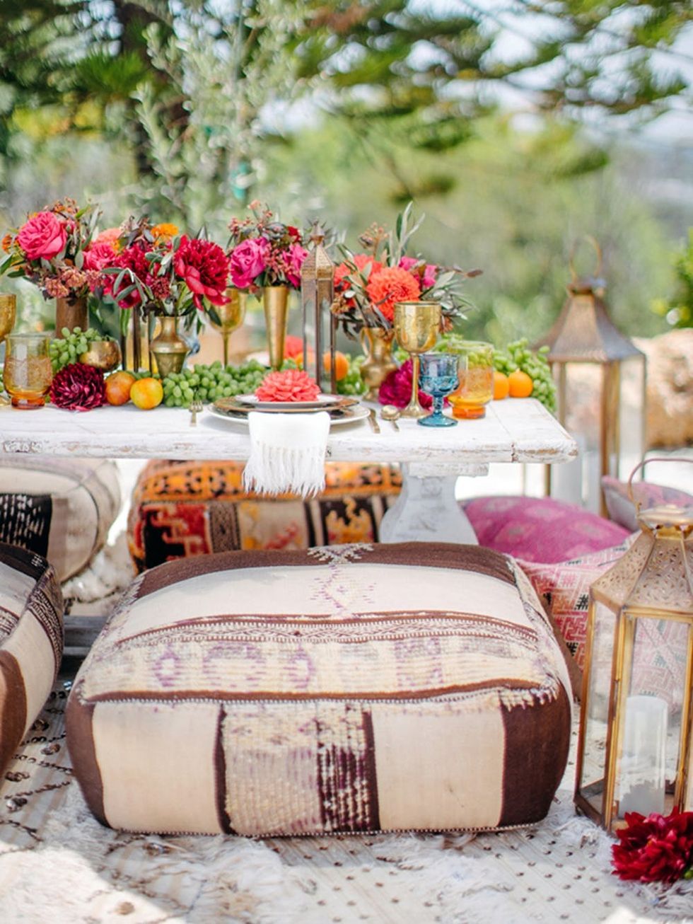 While not everyone can afford a trip to Marrakesh, you can still create the feel of a glam desert gathering with the right accessories and a little bit of planning. Transform any locale, whether it’s a desert oasis, your church basement, or a venue downtown, with hanging florals and citrus accents, relaxed floor poufs, and lots of saturated hues. Get started and revel in the gorgeous #inspo shots below.