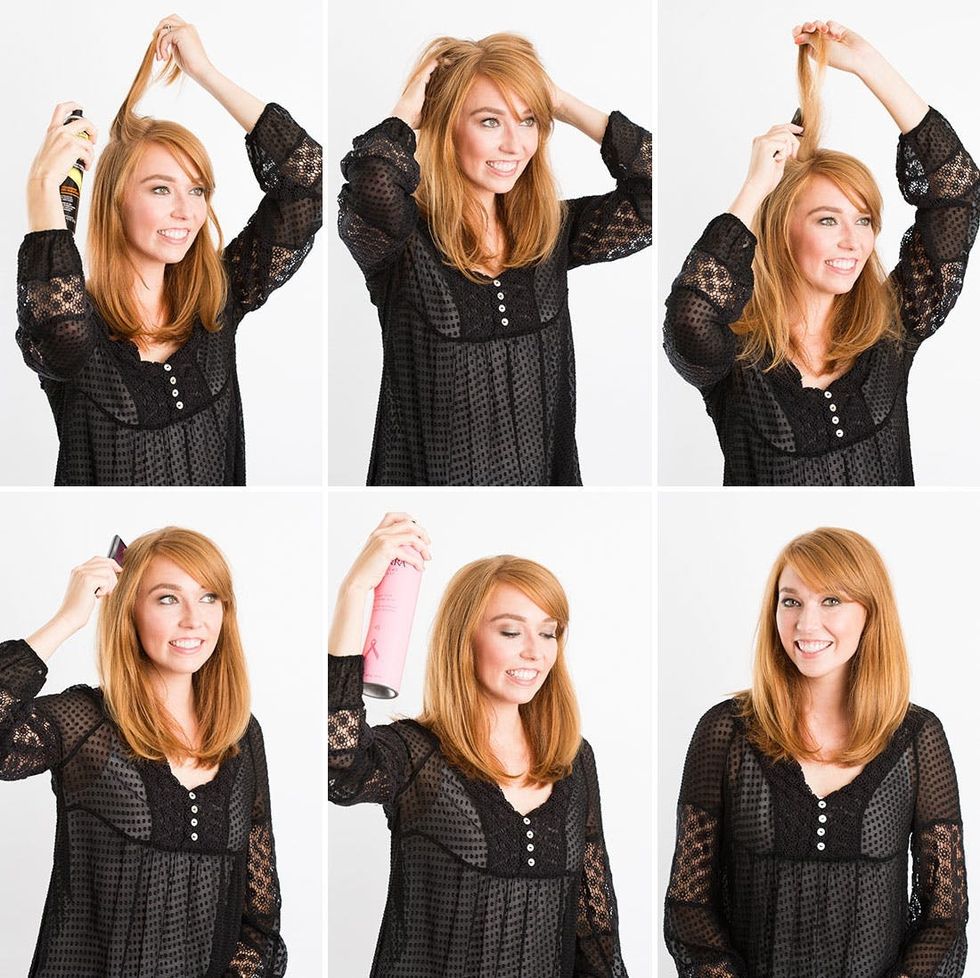 1. Place a heavy side part in your hair using a rat tail comb ($3). Sweep your bangs to one side.