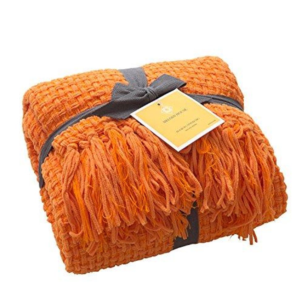 Nothing says "fall" like cuddling up underneath a cozy throw blanket, and this one even has stylish fringe tassels along the edge. It's made from 100% soft microfiber, making it wrinkle- as well as fade-resistant — and you even have the choice of four shades: orange, white, blue, or grey.