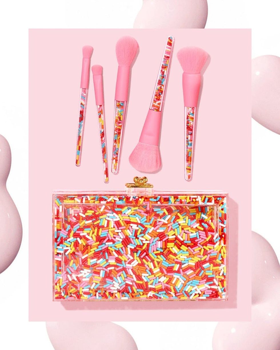 The collection consists of the Let Them Eat Popsicles Lip Set (below, $34), Dream Team Pigment Palette ($42), featuring 12 sprinkle-colored creamy shadows, and the Sugar Wafer Face Palette ($36), which includes bronzer, highlighter, and blush. There are also makeup accessories and tools up for grabs, like the Sprinkle Pool Brush Set (above, $64), the Rainbow Sherbet Lashes ($18), and the I SCREAM Charm Bracelet ($28), a 10-charm bracelet with three of the charms filled with lip and cheek tints.