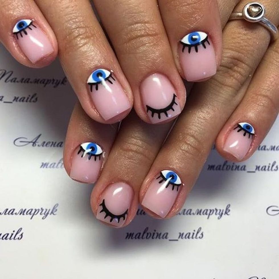 Sheer, nude nails are on fire RN — but evil-eyes and lashes give your digits extra flair. (Photo via Instagram user @malvina_nails)
