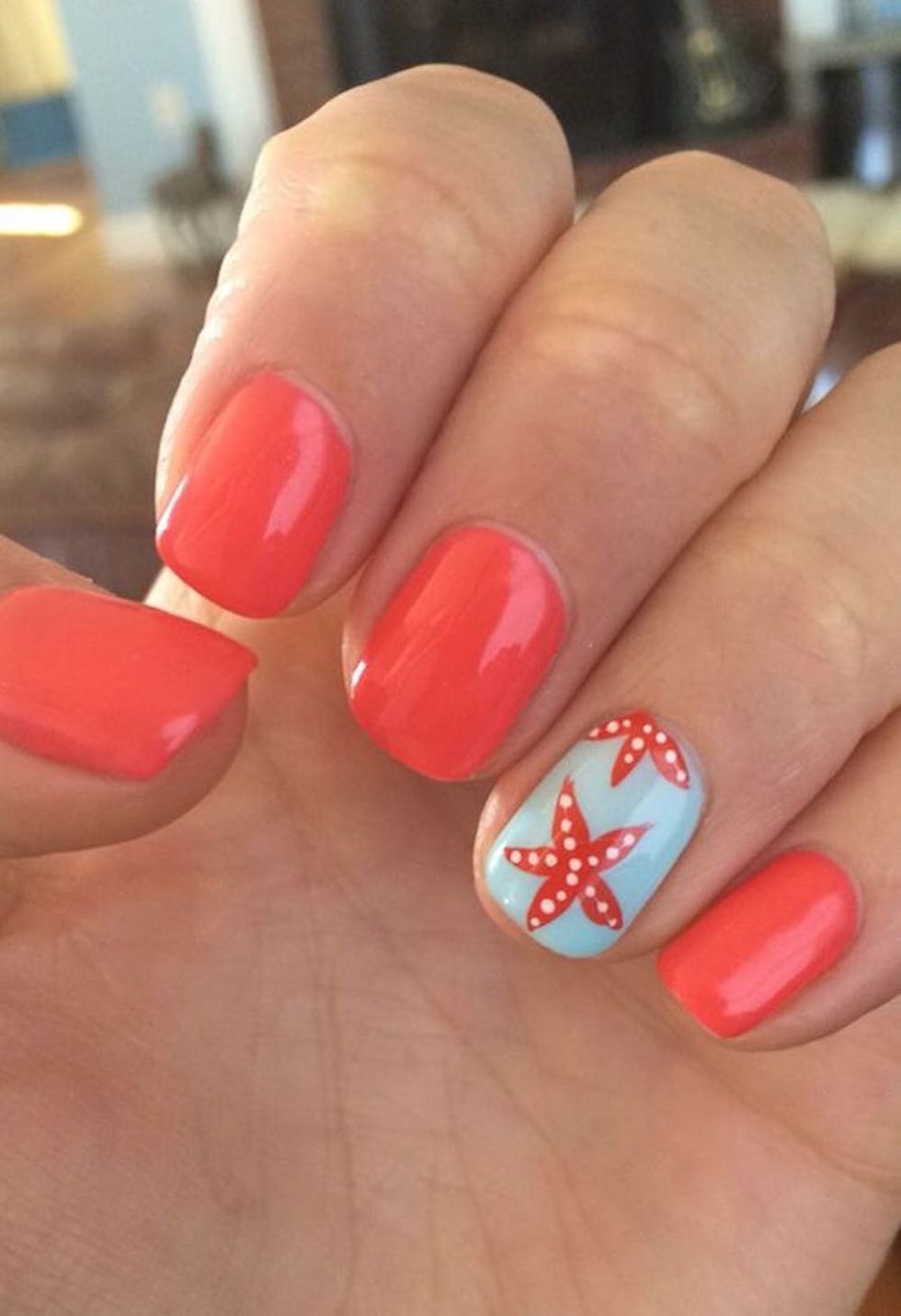 Coral polish with a starfish accent nail is 100 percent beach-ready. (Photo via Pinterest user @Holly Tumiel)