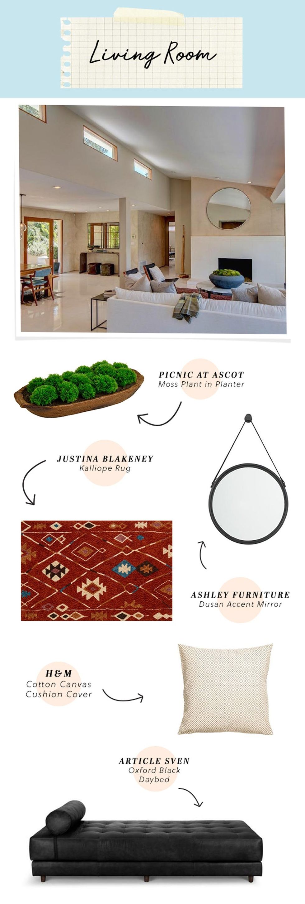 (Clockwise from top) Picnic at Ascot Artificial Moss Plant in Planter ($106), Ashley Furniture Dusan Accent Mirror ($130), H&M Cotton Canvas Cushion Cover ($6), Article Sven Oxford Black Daybed ($1699), Justina Blakeney Kalliope Rug ($499+)