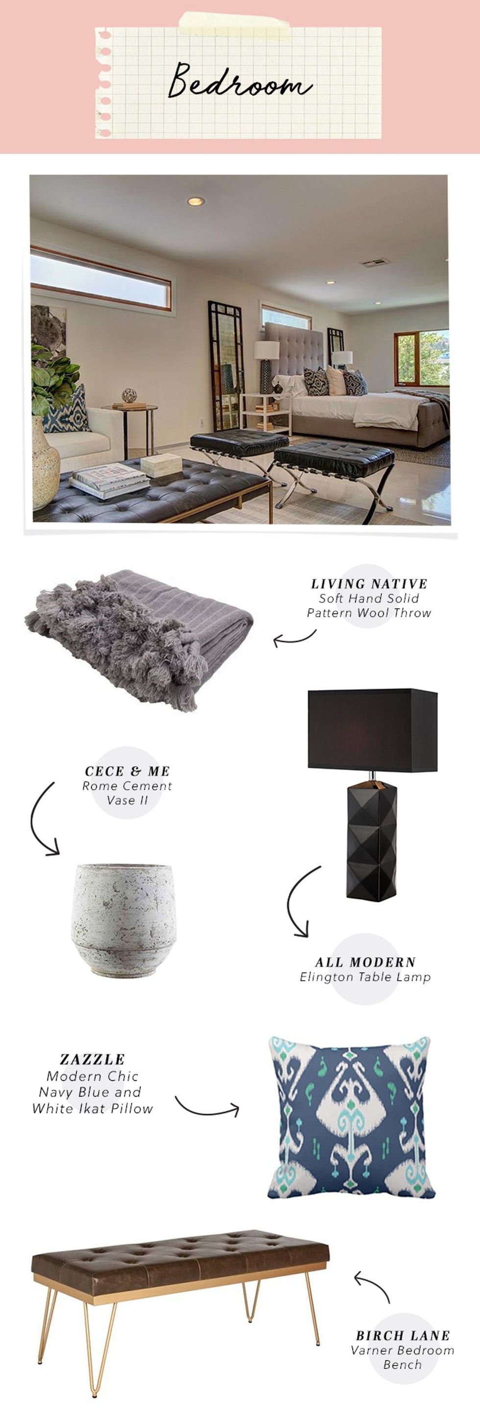 (Clockwise from top) Jaipur Living Native Soft Hand Solid Pattern Wool Throw ($140), All Modern Elington Table Lamp ($158), Zazzle Modern Chic Navy Blue and White Ikat Pillow ($38), Birch Lane Varner Bedroom Bench ($184), Cece & Me Rome Cement Vase II ($54)