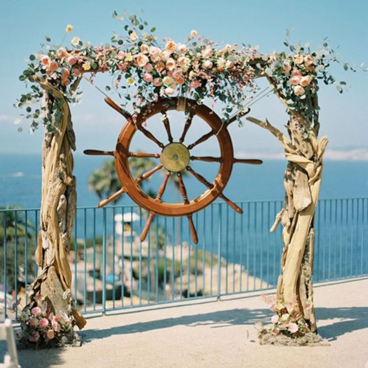 6. Ship Wheel: This ceremony arch is everything! We’re loving the wheel with the delicate flowers, the driftwood poles, and that insane ocean view. *insert heart eye emoji* (via Ashley Kelemen / 100 Layer Cake)