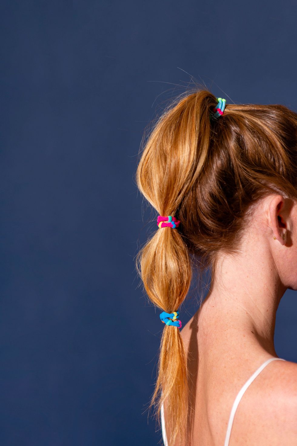 From left to right: Matter Matters ZS Earrings ($55), scünci Rainbow Multi Terry Ponies ($4)